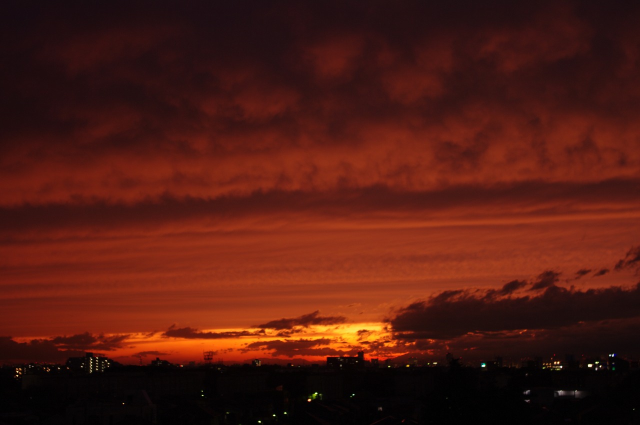 学校の屋上から、久しぶりに真っ赤に燃え上がる夕陽が見れました。